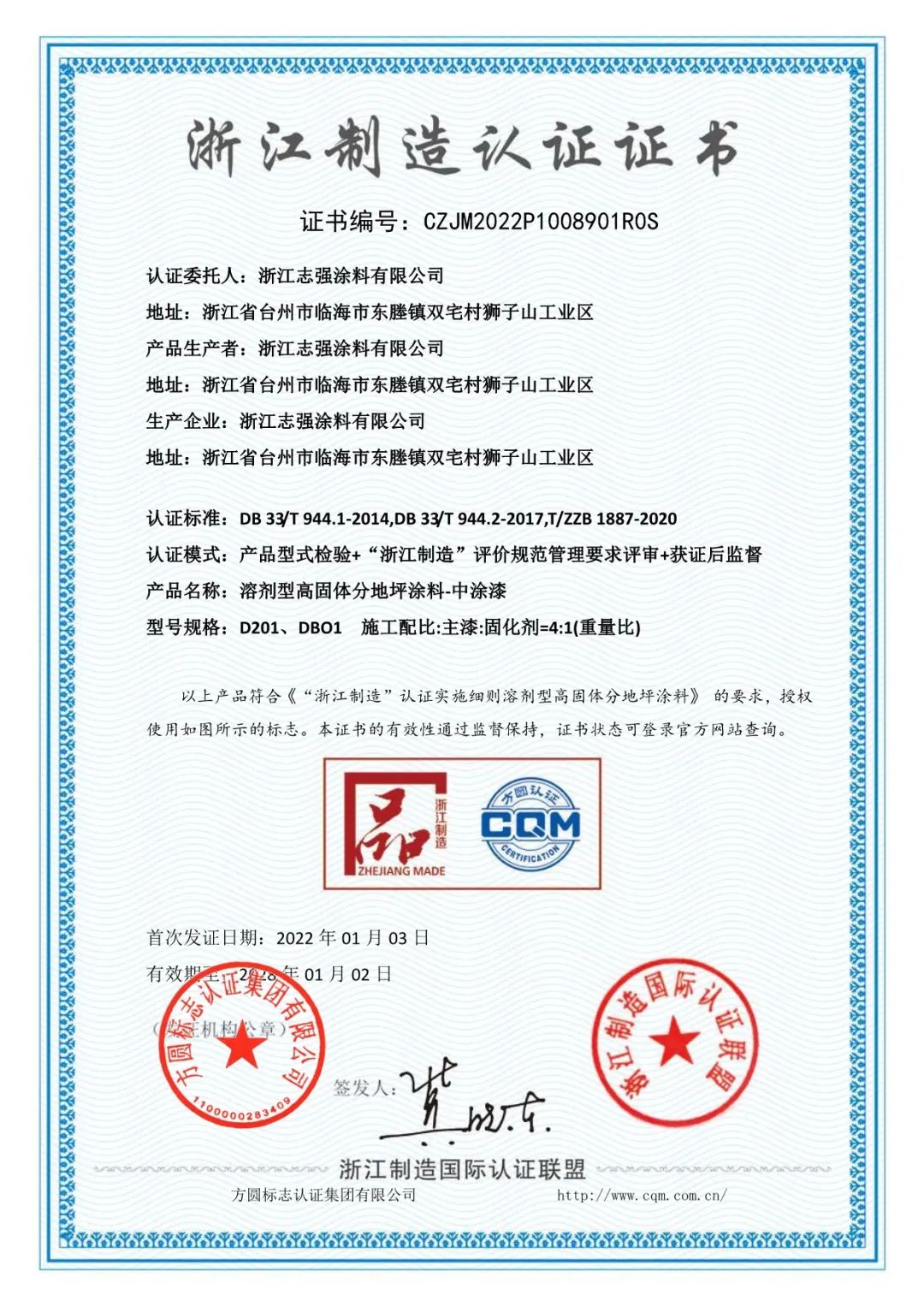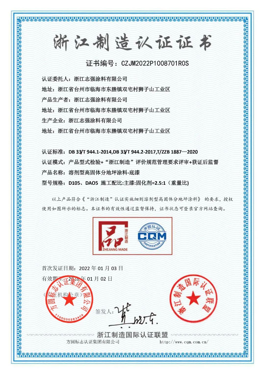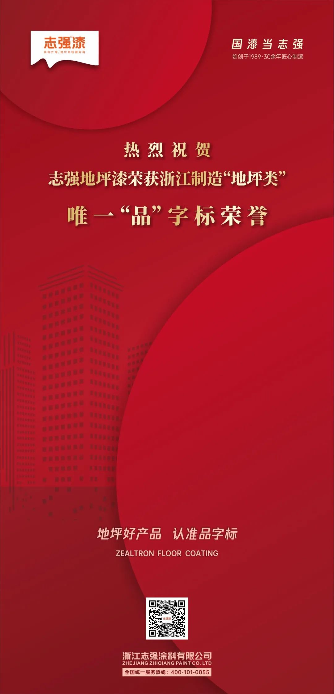 近日,志强地坪漆喜获浙江制造地坪漆类“品”字标荣誉!志强漆是浙江制造“品”字标唯一一家获得地坪涂料类企业!这项荣誉的获得,是市场对我司地坪涂料产品的高度认可,同时也让公司更加坚定对地坪产品品质的高要求。